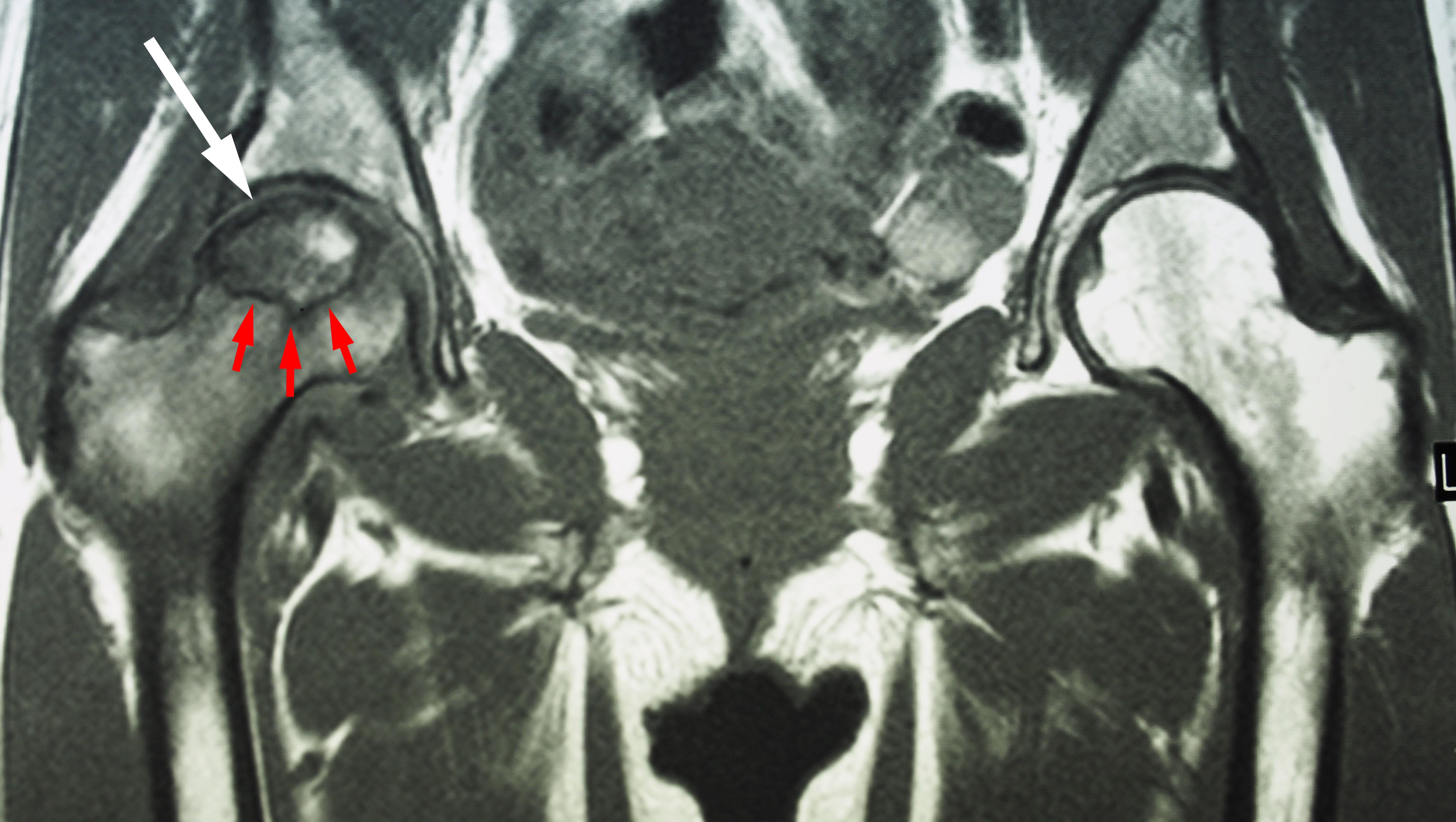 This MRI scan shows osteonecrosis in a patient’s right hip (white arrow). The dark line (red arrows) denotes the border between dead bone and living bone. The patient's left hip is normal.